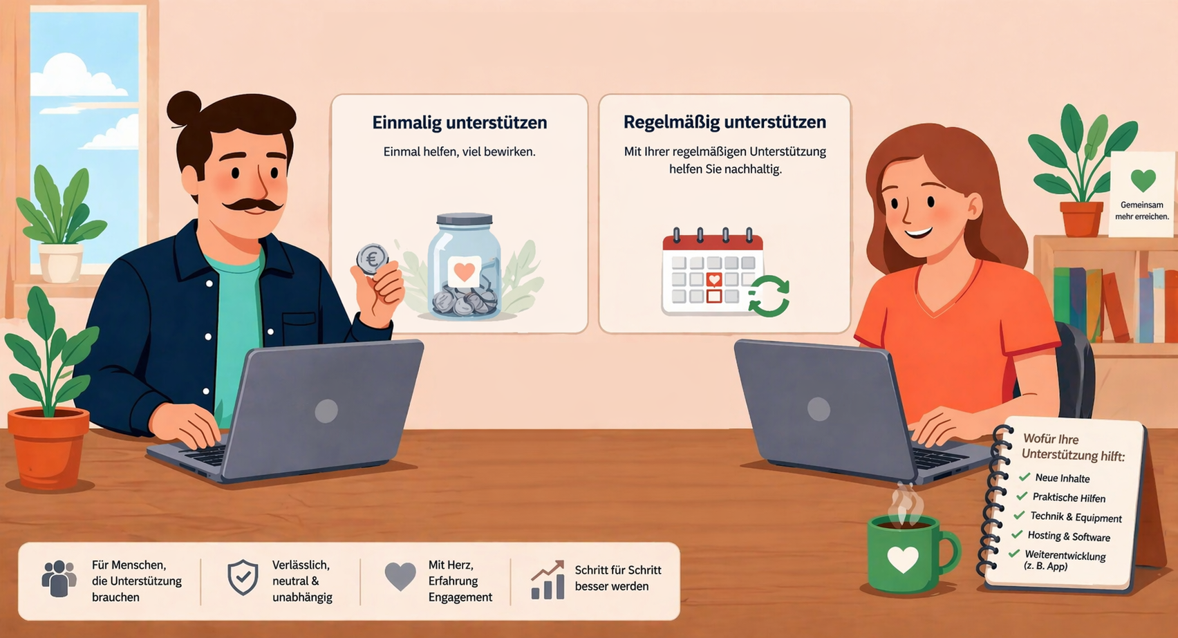 Damit Inhalte, Tools und neue Hilfen entstehen können, braucht es neben persönlichem Engagement auch laufende Kosten – etwa für Hosting, Software, Technik und technisches Equipment.